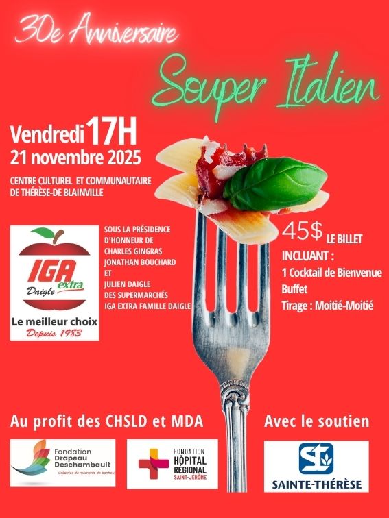 La Fondation Drapeau et Deschambault et la Fondation de l’Hôpital régional de Saint-Jérôme sont heureuses de vous présenter la 30ème édition du Souper italien qui aura lieu le vendredi 21 novembre au Centre culturel et communautaire Thérèse-De Blainville, sous la présidence d'honneur de Messieurs Charles Gingras, Jonathan Bouchard et Julien Daigle des Supermarchés IGA EXTRA Famille Daigle.